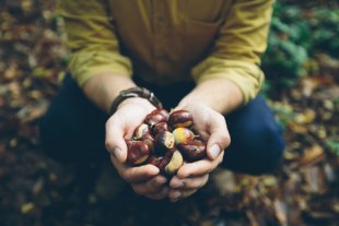 Man holding fresh Chestnuts picked from the forest floor