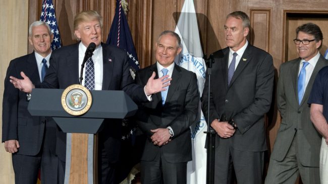 President Donald Trump speaks at EPA headquarters in Washington, DC on March 28, 2017 before signing an energy independence executive order as (from left) Vice President Mike Pence, EPA administrator Scott Pruitt, Secretary of the Interior Ryan Zinke and Secretary of Energy Rick Perry look on. (Photo by Ron Sachs/Pool via Bloomberg)