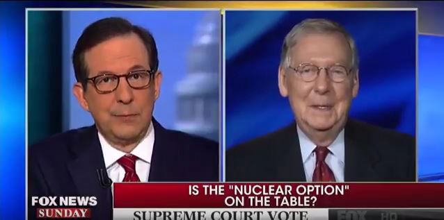 Asked by Fox News Sunday host Chris Wallace about whether he had the required votes to invoke cloture (ending debate) on the nomination of Neil Gorsuch to fill the seat he kept open for a year following the death of Antonin Scalia, McConnell said he was not sure, but that it didn’t matter. Though he would need the votes of at least eight Senate Democrats to achieve the required 60-vote threshold, McConnell suggested if he doesn’t get it, he will simply change the rule to make the requirement 51 votes — a procedure known as the “nuclear option.”