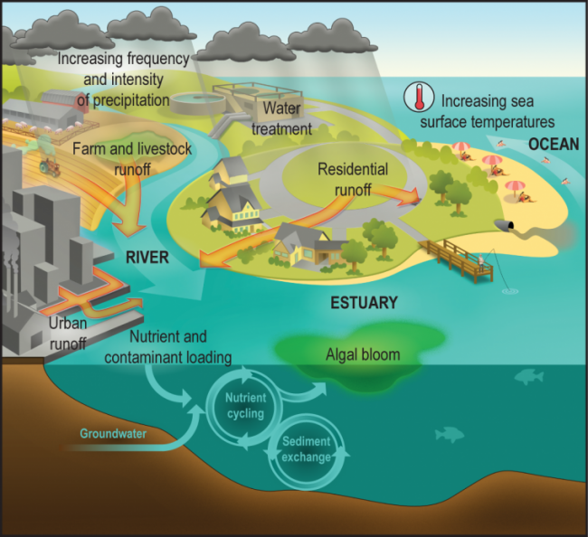 Precipitation and temperature changes affect fresh and marine water quantity and quality primarily through urban, rural and agricultural runoff. (image: GlobalChange.gov)