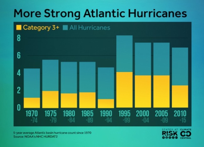 In an average hurricane season in the Atlantic basin today, there are twice as many major hurricanes (Category 3 or higher) than there were in 1970, reports Climate Central.