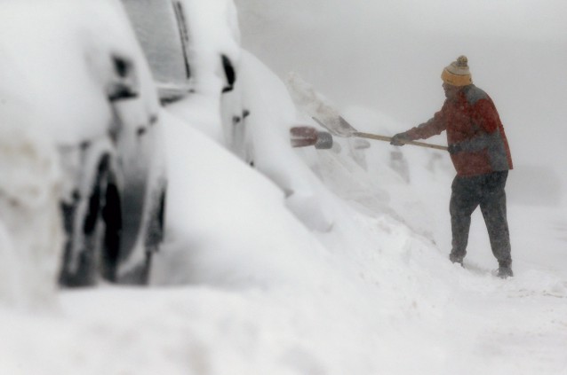 A man shovels snow in the East Boston neighborhood of Boston, Sunday, Feb. 15, 2015.