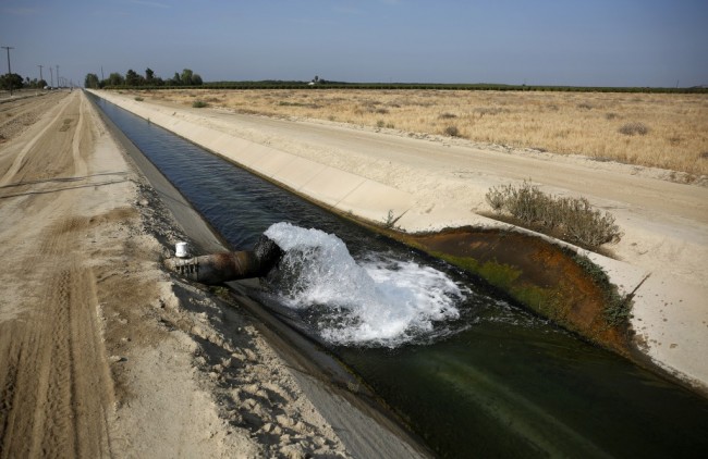 Water is pumped from a well into an irrigation ditch near Fresno, Calif.