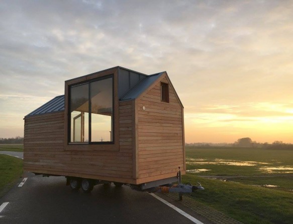 Call us a bit jaded, but after a while many tiny houses start to look alike: tiny A-frame structures with eaves and a porch, lots of rustic wood, a loft bed, composting toilet. This is all fine, good and functional, but it can also feel somewhat generic and leave those whose tastes lean modern a little wanting. We ran across this tiny house on Treehugger by a Dutch outfit that calls themselves Woonpioniers. Yes, their “Porta Palace”, as they call it, is still made of wood and has an A-frame (albeit an asymmetrical one), loft bed and composting toilet, but its sleek and clean design give it an overall effect that is very removed from Laura Ingalls and her houses on prairies.