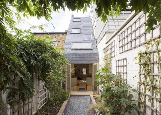 The original building was already positioned on a narrow plot on the busy high street of St John’s Hill, Clapham. The structure, measuring just 2.3 meters wide, presented certain challenges in terms of organizing the spaces. Alma-nac managed to build the Slim House on a small budget and within those tight space constraints. Its sloped roof reduced the construction costs, while staggered rooflights allowed for natural light to reach the deepest corners of the property.