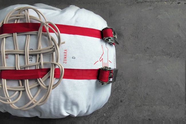 most immigrants who land upon europe’s southern shores are natives of central and western africa, making their principle obstacle miles upon miles of desert. the ‘baksheesh bag’ is the improvised tool of choice. here, the distant border is replaced by the more immediate issue of vehicle checkpoints. of course, the self-appointed officers holding the post will let the truck go, but it will take a small baksheesh–gift–to do so. the satchel is made of bulk rice sacks sewn together. printed on the surface from top to bottom is a decreasing amount of central african francs, and the names of cities with checkpoints that stand between them and the sea. the sack can be stuffed with personal items for travel and as bribe offerings when the money runs out. rolled up and fastened with ratchets, it also works as a makeshift seat.