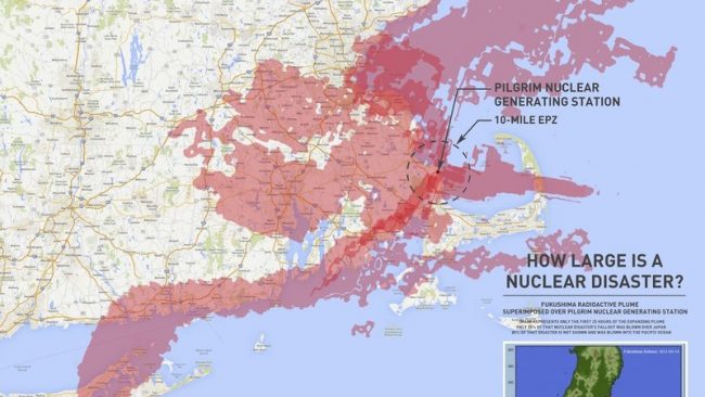 The shaded area of the above image represents Fukushima’s fallout plume from 25 hours after the accident, superimposed on Pilgrim, which has the same type of reactor as Fukushima. Within a day of a Fukushima-type accident at Pilgrim, radiation contamination could extend from Gloucester to Worcester to Providence, RI to Long Island,NY and the Connecticut shore, including Cape Cod and Greater Boston.