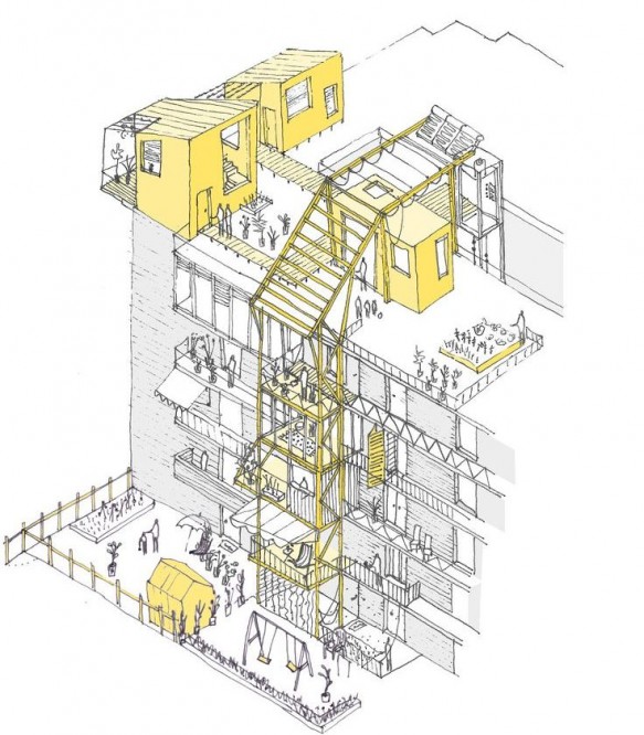 While building new is nifty and all, order there’s something very appealing about adaptive reuse. This is why projects like the Providence Arcade, which took an underused indoor shopping mall and converted it to a retail/micro-residential complex, are so appealing. Why build new and use more resources if you can make something that already exists work? A couple young Spanish architects have conceived a project that thinks along these lines, making an existing housing complex more adaptable, social and sustainable than its current moribund state.