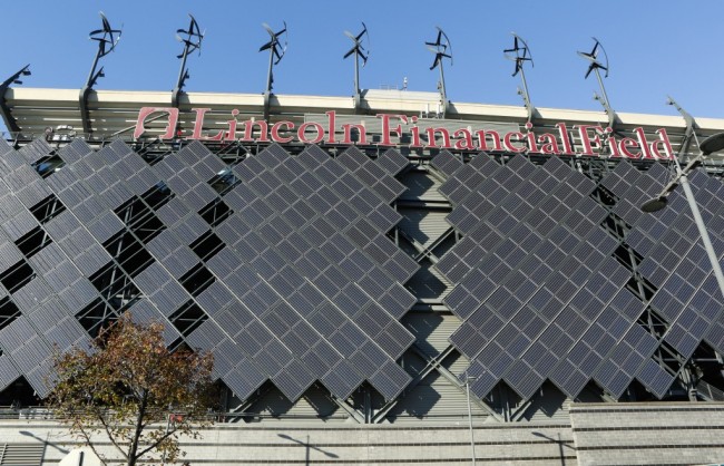Micro-wind turbines and solar panels installed at Lincoln Financial Field generate renewable energy during NRG Home’s 2nd Annual Media Charity Flag Football Game in Philadelphia Wednesday, November 19, 2014.