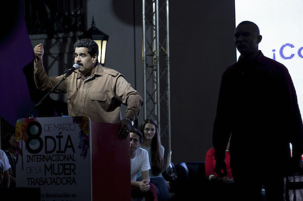 Venezuela’s President Nicolas Maduro speaks at rally in Bolivar Square to commemorate International Women’s Day in Caracas, order Venezuela on March 8, 2014. (AP Photo/Alejandro Cegarra)