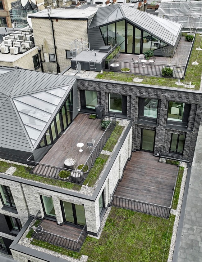 the london-based practice describes the development as ‘a new type of contemporary beauty, one which is less ostentatious yet captivating, capable to build on the qualities of its location to provide a highly sustainable solution that embodies high quality design and craftsmanship.’ despite its monolithic appearance, the project highlights the original character of the building, but simultaneously introduces a contemporary elements; the most obvious intervention takes form as two jewel-like geometrical pavilions that have been placed on the rooftop, opening up a series of unexpected views over the city.