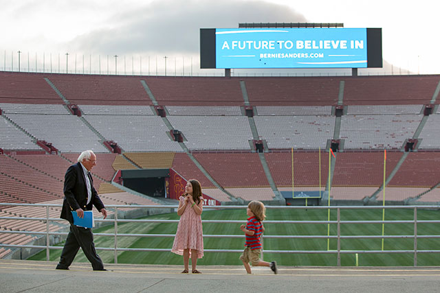 Sen. Bernie Sanders of Vermont, a Democratic presidential candidate, is greeted by his grandchildren Ella and Dylan Driscoll before speaking at a campaign rally at the Los Angeles Memorial Coliseum three days before the California primary, in Los Angeles, June 4, 2016. (Monica Almeida / The New York Times)