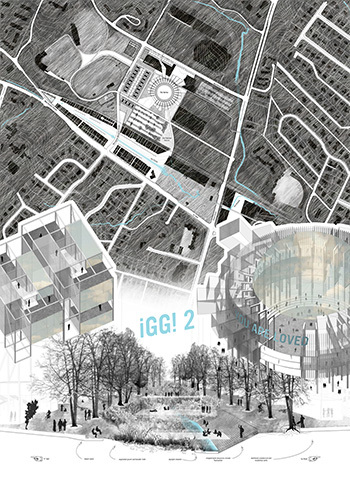 Team 2, which was led by landscape architecture professor Julie Bargmann, won the public, student, and faculty awards. The team envisioned connecting the community and university with Ivy Road by making the road an academic, environmental, and commercial hub for the western edge of Charlottesville. Using an existing culverted stream under the site as an organizational element, the proposal included a pedestrian mall, multi-level housing, and a bridge in memory of Morgan Harrington, a Virginia Tech student, who disappeared there in 2009. The team sought to create a place of empowerment and community.