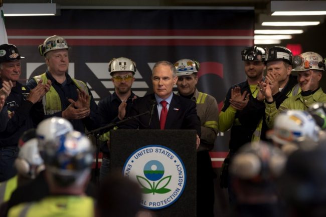 Environmental Protection Agency Administrator Scott Pruitt speaks with coal miners at the Harvey Mine on April 13 in Sycamore, Pa. (Justin Merriman/Getty Images)
