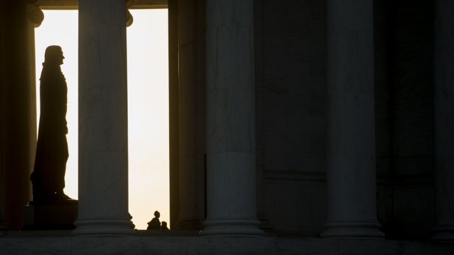 The sun sets behind the Jefferson Memorial in Washington. (Photo By Bill Clark/CQ Roll Call)