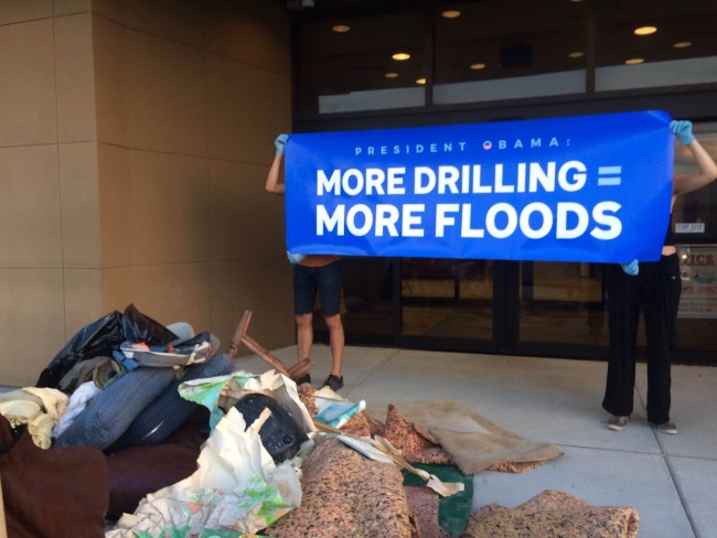 The protesters asked President Obama, who was in Louisiana on Tuesday to address the Baton Rouge flooding, to cancel the sale. Obama did not respond to the petition, nor did he mention climate change in his public remarks.