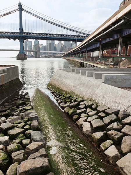 As part of the East River Waterfront Esplanade in Manhattan, which Ken Smith Workshop has been working on for a decade, Smith and his studio designed and built a prototype mussel habitat. Working with ecologists and marine engineers, Smith selected a concrete-textured substrate and designed a gradient of rocks to encourage the growth of mussel colonies.