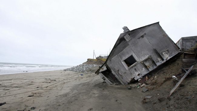 A home destroyed by beach erosion lies on its side in the the Alaskan village of Shishmaref. (Photo by Gabriel Bouys/AFP/Getty Images)