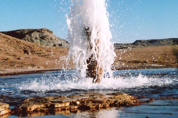 A cold-water geyser from an unplugged oil exploration well in Utah. (Mike Bickle / Cambridge Centre for CCS)