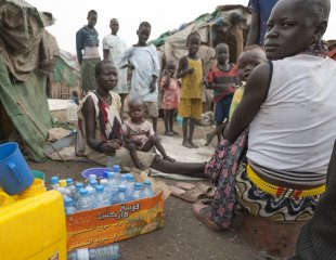 People prepare plastic containers to collect water at a refugee camp in Juba, South Sudan in 2012.
