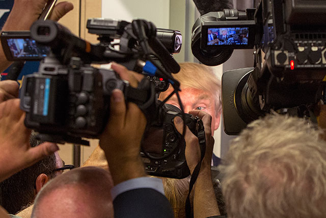 Reporters surround Donald Trump in the spin room at the end of the Republican presidential debate at the Ronald Reagan Presidential Library in Simi Valley, California, September 16, 2015. (Photo: Monica Almeida / The New York Times)