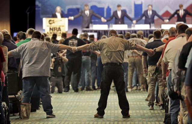 National Rifle Association members hold hands during the opening prayer at the annual meeting of members at the NRA convention Saturday, April 11, 2015, in Nashville, Tenn.