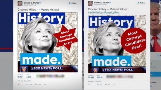 The latest dog-whistle images from Republican presidential candidate Donald Trump’s Twitter feed. The original image is on the left; the one that replaced it is on the right. (Twitter via CNN)