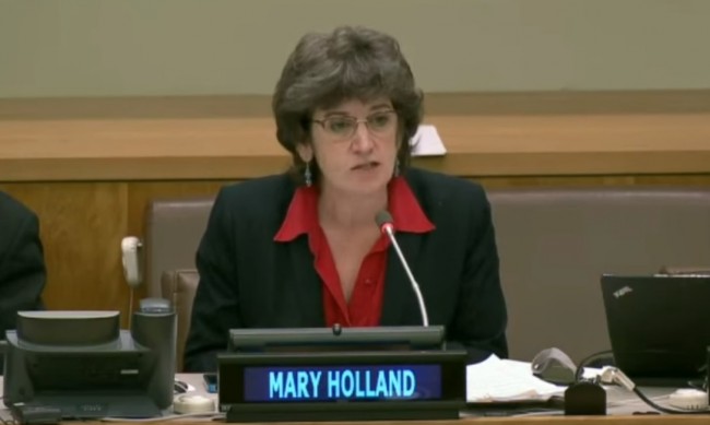 Law Professor Mary Holland addressing the U.N. regarding civil rights related to government vaccine policies.