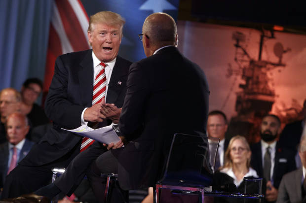I’ll start with Lauer’s handling of Trump, given that the Republican candidate has an especially insane and ignorant view of foreign policy that demands precisely the sort of aggressive pushback that Lauer did not provide. Early on in his portion of the forum, Trump declared “I was totally against the war in Iraq.” That was a false statement. It’s been debunked several times over by various different media outlets. The moment he said it, NBC News’ senior political editor tweeted that Trump was lying. Hillary Clinton had even made a point of bringing up Trump’s 2002 interview supporting the Iraq invasion during her portion of the forum (which preceded Trump’s).