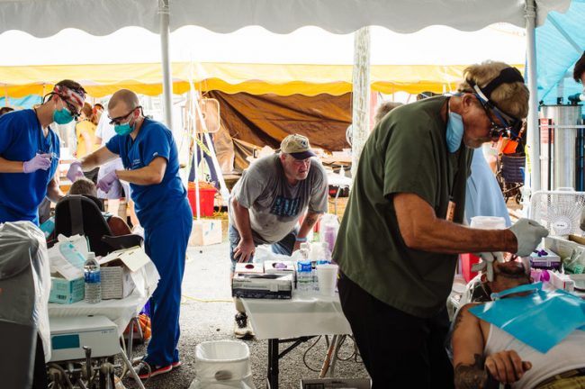 All around Smith were uninsured patients receiving free dental or medical care, including dozens of men and women in side-by-side dental chairs in the open air. Organizers mercifully arranged the long line of people waiting to have teeth pulled so that they were facing away from those currently enduring extractions.