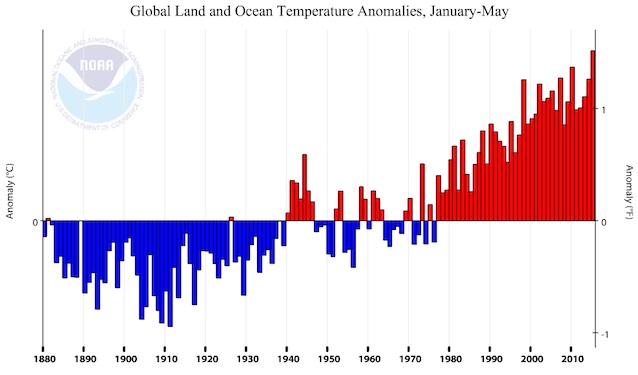 - Hottest January-May on record by far “at 0.85°C (1.53°F) above the 20th century average, surpassing the previous record set in 2010 by 0.09°C (0.16°F).”