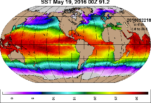 This movie of sea surface temperature reveals the detail of our satellite observation systems… compared with the 16 year old image at the top of this posting one can see ocean surface temperatures are on a steady deadly rise!
