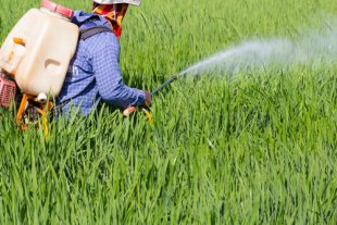 farmer spraying pesticide in the rice field