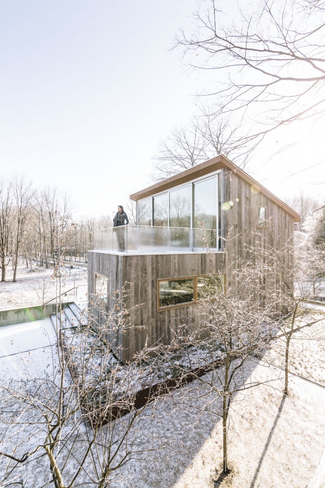 For a devoted environmentalist—before going to Columbia University for her master’s in architecture and founding her design office in her early 40s, Davis served on the boards of environmental advocacy groups Riverkeeper and the National Resources Defense Council—the question was more than rhetorical. She and her former husband bought the Garrison property on which the new house sits with the intention of maintaining the open terrain and view for their home across the road. (The road itself is landmarked, being the erstwhile post road from New York to Albany.) For purposes of preservation, Davis kept to the extant square foundation of the house that was previously on the site, and the structure has an M.C. Escher–like intricacy. She extruded the foundations upward to create a retaining wall that cradles the new home—a one-and-a-half-story cubic volume crowned by a shed roof that references the traditional architecture of the barn a few yards away. Davis then carved away at this volume, dividing it into quadrants in a push-pull fashion. The vestigial northeast quadrant of the ground floor is recovered as an elevated deck, lifted directly above the kitchen.