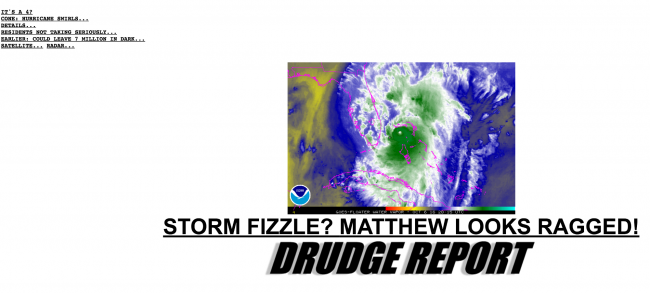 The Drudge Report’s homepage led with a headline questioning whether the storm was fizzling, even as national, state, and local officials called for residents to heed warnings to care for loved ones, take shelter, or evacuate.