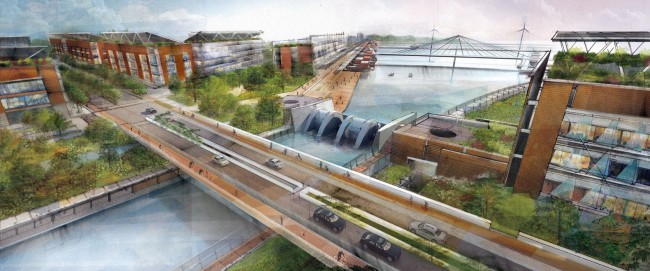 The neighborhood in question is the perfect candidate for a resilient facelift. It consumes a peninsula that juts out into the bay, giving it a lengthy coastline on three sides The concept is simple. If the tides are rising, why not harness some energy from them? So, that’s what the redesigned neighborhood is proposed to do. The community can draw clean energy through new, advanced hydroelectric systems that generate power from tidal changes. Other renewable systems (solar, wind, geothermal, biomass) enable the community to achieve greater energy independence. The neighborhood is built using a system of courtyards integrated into a new community with self-sustaining renewable energy generation on each block. The new masterplan integrates existing buildings, institutions and campuses while adding such new features as a hydroelectric canal and a system of retention ponds.