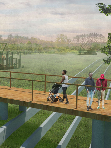 The winning team for the Kinston effort put forward a town master plan that bundled different scales of interventions into a cohesive approach. Their solutions would boost flood prevention, help Kinston’s citizens better understand the causes of flooding, and increase economic development through improvements in livability and recreation.