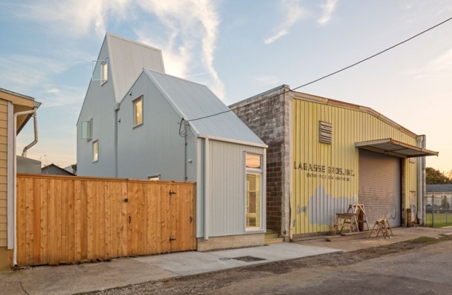 working closely with the developer and builder, the new orlean’s starter house is sited between industrial warehouses and historic buildings. the constricting footprint, coupled with area ground rules resulted in a staggered form.