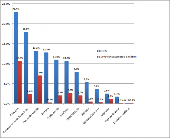 The data was collected from parents with vaccine-free children via an internet questionnaire by vaccineinjury.info and Andreas Bachmair, a German classical homeopathic practitioner. The website is not a pretty one (including Google ads for vaccines) but the actual data is what counts. The independent study is self-funded and is not sponsored by a large “credible” non-profit or government health organization with political and financial conflicts of interest. Each one of the 8000 cases are actual cases with medical documentation. Three other studies had similar results according to Bachmair and are reported below.