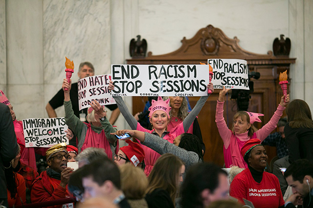 The 61-year-old Fairooz, along with fellow Code Pink activists Tighe Barry and Lenny Bianchi, were arrested while attending a January 10 Senate hearing. Fairooz laughed out loud when Sen. Richard Shelby (R-Ala.) had the gall to state that Sessions’ record of “treating all Americans equally under the law is clear and well-documented.”