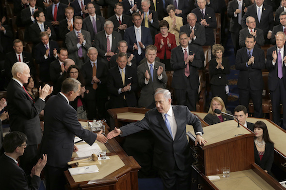 Israeli Prime Minister Benjamin Netanyahu, online center, reaches to shake hands with House Speaker John Boehner after addressing a joint meeting of Congress in Washington on March 3. (AP / J. Scott Applewhite)