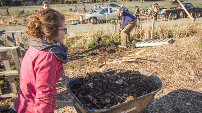 It’s a drizzly, chilly, gray Saturday, typical of January in Seattle. In just a few hours, the Seahawks will host the Packers for the NFC Championship. While the rest of the city slugs its first tailgate beer of what will become an epic afternoon of football, 60 or so unpaid farmhands are hard at work. They wheelbarrow wood chips, prune pear trees, and remove invasive species from the hillside urban garden, preparing it for spring. Some are uprooting the profusion of propagating strawberry plants that are taking over pathways and smothering other ground-cover herbage (hence the gratis strawberry plants).
