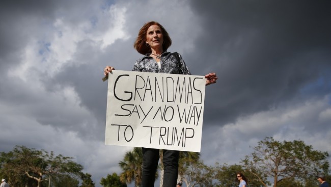 Mary Dickens holds a sign outside a Republican presidential candidate Donald Trump campaign rally in Boca Raton, Fla., Sunday, March 13, 2016.
