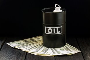 Oil business concept. Barrel of oil on dollar bills on a dark wooden background