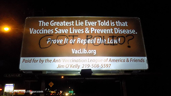 Not even phased by the act, O’Kelly remains committed to the cause, having openly emblazoned his phone number on the giant billboards. If even just one parent reconsiders vaccination for his or her child as a result of the large signs, then the campaign will be a success, in O’Kelly’s view. The ultimate purpose of the billboards, he says, is to prompt government officials to withdraw approval for all vaccines pending solid evidence that they work as claimed.