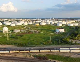 Aerial view of tank farm for bulk petroleum and gasoline storage next to rail line, Houston, Texas.