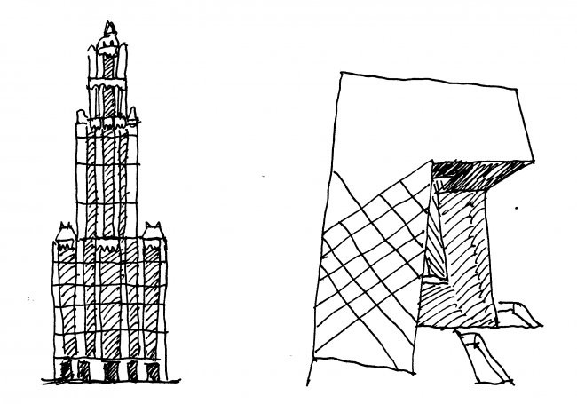 Left: Balanced form reinforces tectonic stability, Woolworth Building, New York City, 1913, 792 feet or 241 meters. Right: Cantilevered form generates anxiety, Giant Underpants Building, Beijing, 2008, 768 feet or 234 meters.