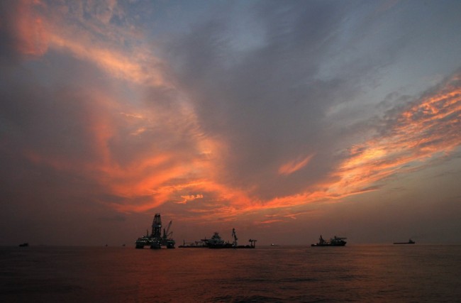 Vessels assist in the drilling of the Deepwater Horizon relief well on the Gulf of Mexico near the coast of Louisiana at sunset. The BP leak, the worst-ever in offshore U.S. waters, occurred at a well that the company was in the process of temporarily closing. The accident killed 11 workers and spilled up to 172 million gallons of oil.