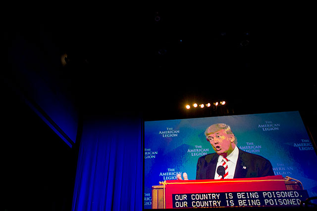 A screen shows Donald Trump’s address to the American Legion convention in Cincinnati, on September 1, 2016. (Sam Hodgson / The New York Times)
