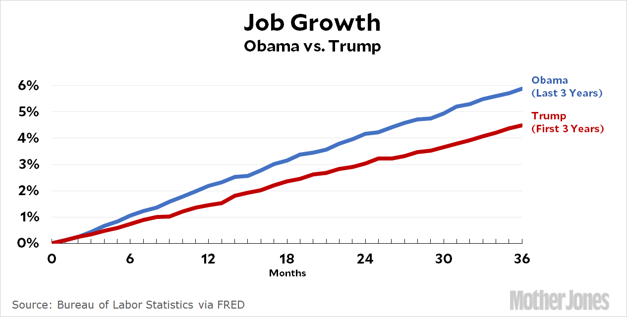 Since his administration began, Trump has attacked Obama’s record of job creation and touted his own. Perhaps long-time readers here at the Washington Monthly will enjoy the fact that I intend to expose that lie based on information provided by Steve Benen and Kevin Drum. Here’s Benen: